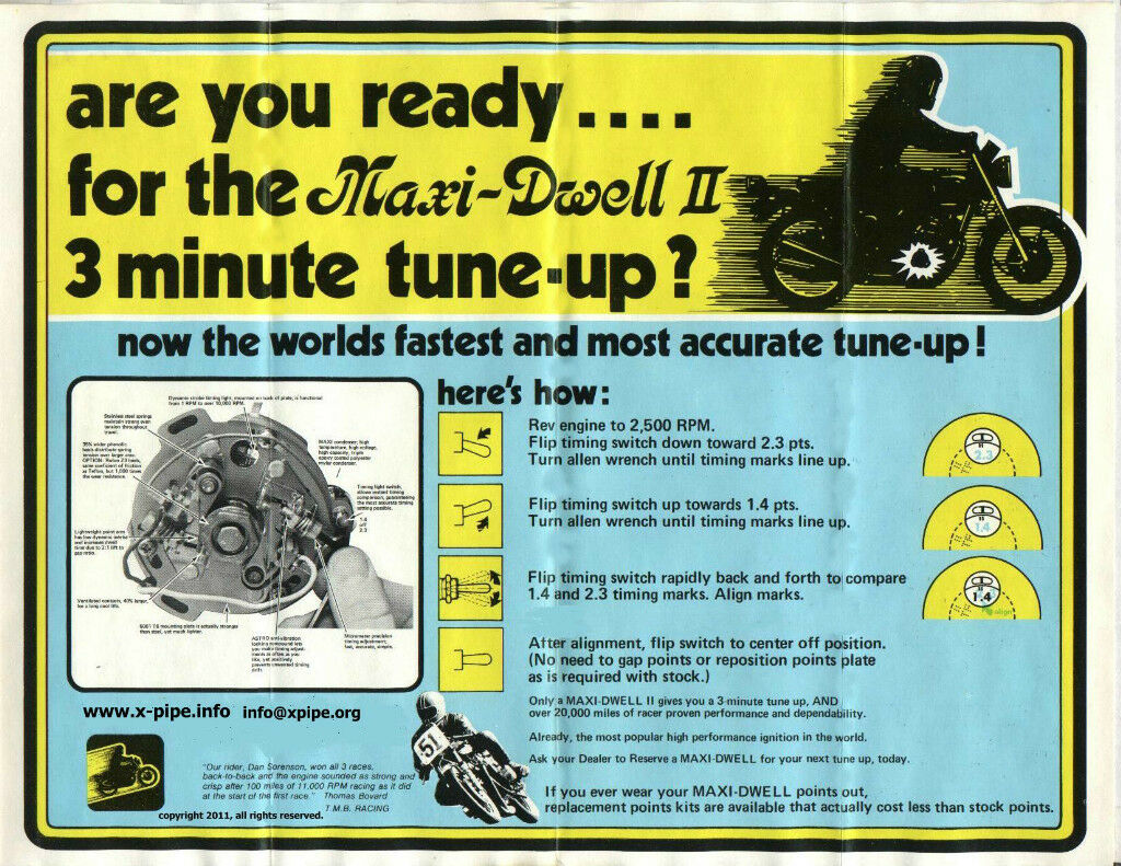 12) Can the Maxi-Dwell IITM pay for itself?One fellow on a budget emailed me stating, "Points is points." He went on to say that he buys his points at the junk yard, used, for $17.00 each. We know that he has a lot of time on his hands, but is he saving any money? Let's assume that the used junk yard points are new and will last about 2,000 miles. Let's also assume that he can also get condensers at the same price and they are good as new. If a dealer tune up costs $125.00, then it costs about $193.00 and a week end at the shop, every 2,000 miles, to keep our friend's motorcycle engine running. Now, assume that the Maxi-Dwell IITM ignition will last 100,000 miles and our friend can tune it up himself, in 3 minutes. The Maxi-Dwell IITM will save about 50 weekends at the dealership waiting for a tune up and about $9,650 in tune up bills and junk yard points & condensers. If he were a little smarter, he’d buy new points and condensers. 2014 mail order prices are $32.85 per point and $39.95 per condenser and $125 to $150 per tune up, making each tune up cost $270.60 to $295.60. Assuming that new points and condensers will last 4,000 miles, your new Maxi-Dwell IITM would save you between $6,765 and $7,390, and 25 weekends at the shop, assuming prices don’t continue to go up (sure). Only Maxi-Dwell IITM pays for itself, in the first 3 minutes.One Maxi-Dwell IITM could be the last ignition system your motorcycle will ever need.