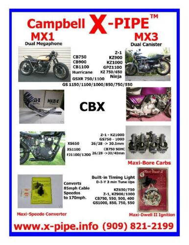 PS: If you are looking for the BEST EXHAUST SYSTEM ON THE PLANET, please contact me & I'll send you info about my fabulous Campbell X-PIPEtm Exhaust (no jet kit, ever). Enjoy watching Jason Lee on an X-PIPEtm powered CB750: See video of Jason Lee on a CB750 with MX1 X-PIPEtm. Jason Lee on an MX1 X-PIPEtm Exhaust.